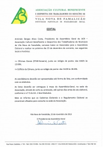 Armindo Borges Alves Costa, Presidente da Assembleia Geral da ACB - convoca todos os Associados para a Assembleia Eleitoral a realizar no próximo dia 23 de dezembro do corrente, nos seguintes locais e horários: Oficinas gerais (ETAR-Esmeriz), junto ao relógio de ponto: das 8:00h às 13:00h; Edifício da Câmara, junto ao relógio de ponto: das 14:00 às 18:45h. As candidaturas deverão ser apresentadas sob forma de lista, em conformidade com os estatutos. As listas deverão ser entregues à mesa da Assembleia-Geral, na sede da Associação, através de carta ou protocolo, até quinze dias antes do ato eleitoral, conforme o nº 3 do Art. 2 dos Estatutos. Mais se informa que os Cadernos Eleitorais e o Regulamento Eleitoral se encontram afixados para consulta na sede da Associação. Convocatória para Assembleia Eleitoral Download pdf »