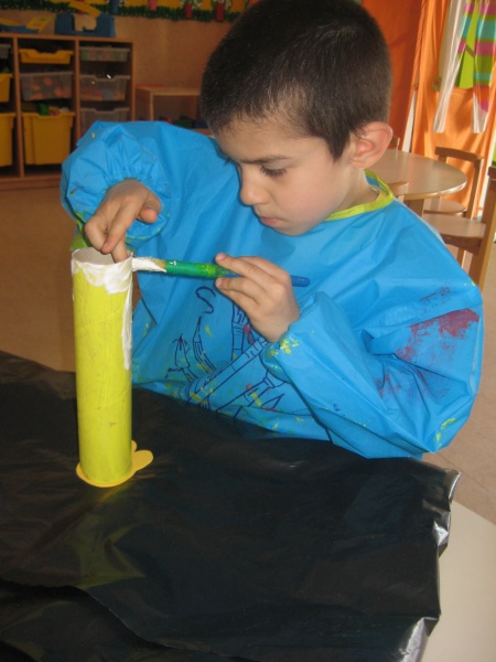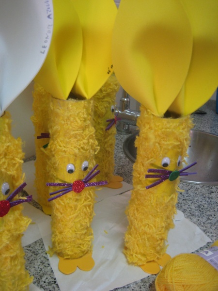 Reciclamos algum material e assim fizemos um coelhinho criativo e colorido para a páscoa. Pintamos de amarelo tubos de cartão, de seguida colamos lã também amarela á volta dos tubos. Fomos assim aos poucos construindo os coelhinhos da páscoa. Para que os coelhinhos ficassem mais doces colocamos dentro de cada um uma surpresa. |