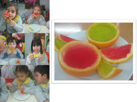 A laranja foi a fruta eleita para a tarde culinária de quinta-feira. Começamos por utilizar o sumo e a polpa das laranjas para confecionar um delicioso sumo natural para o lanche. Depois, aproveitamos as metades das cascas das laranjas (devidamente limpas) para rechear com um preparado de gelatina. O resultado final foram uns coloridos gomos de gelatina com sabor a morango e tutti-frutti. Para além de esta ser uma receita simples, prática e original, permite utilizar gelatinas de diversas cores e sabores. Esta poderá ser uma ótima sugestão para festas de aniversário! Laranja Download pdf » |