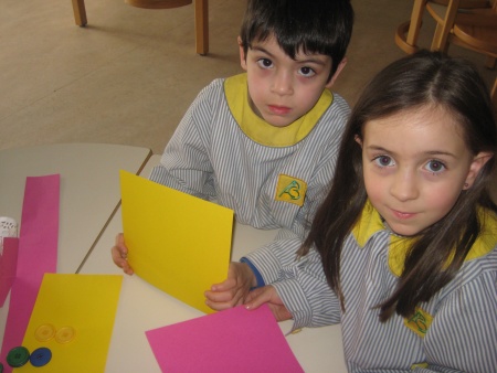 Fizemos umas cestinhas com cartolinas de várias cores, naprões brancos e colagem de botões.