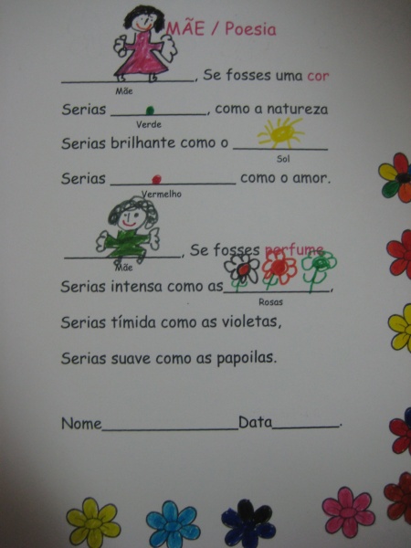 Para ti mãe, que me proteges e amas incondicionalmente: Mãe, neste dia especial Fiz um poema para ti Tu para mim és fenomenal E eu gosto muito de ti. Fiz também um porta-chaves Com muito amor e carinho Junto a estes dois miminhos Mais um grande beijinho. |