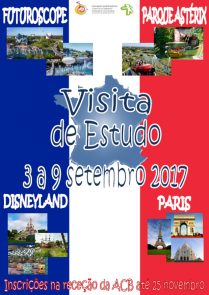 O Centro Infantil e Juvenil da ACB pretende realizar uma visita de estudo a França (Futuroscope - Poitiers; Paris; Disneyland; Parque Asterix), no período de 3 a 9 de setembro de 2017. Este ano abrir-se-á mais uma vez a participação aos filhos de associados com idade igual ou superior a 12 anos. A inscrição deverá ser feita até dia 25 de novembro de 2016, junto da equipa educativa (para as crianças/jovens das valências) ou na receção da ACB para os filhos de associados. As vagas são limitadas e por ordem de inscrição, existindo o critério de prioridade para os jovens que frequentam o Centro de Estudos e CATL. |