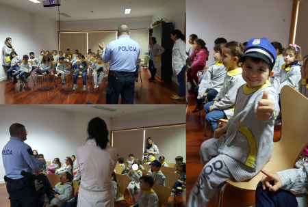 Foi na tarde do dia 30 de janeiro que as crianças do Jardim de Infância receberam a visita do Sr. Agente Silva, representante do Programa Escola Segura da esquadra de Famalicão. A iniciativa que pretende incutir e promover noções como a segurança ou a autoproteção é transmitida aos mais pequenos através de um conjunto de pequenas histórias, de carácter pedagógico, que fazem parte da coleção “Eu faço como diz o Falco”, mascote da Polícia de Segurança Pública. "Os cliques da Maria" foi a história escolhida para transmitir a importância do uso das cadeiras ou dos assentos elevatórios e a utilização dos cintos de segurança, alertando para os procedimentos adotados na entrada e saída dos veículos. Aproveitamos para deixar o agradecimento à Polícia de Segurança Pública de Famalicão pela promoção desta iniciativa junto dos mais pequenos. Crianças seguras são, sem dúvida, crianças mais felizes! |
