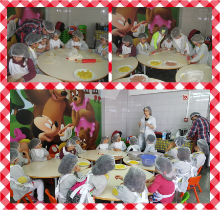 Na tarde da passada sexta-feira recebemos a visita de José Freitas, Pai de um dos nossos meninos finalistas do Jardim de Infância, o Márcio. "Zé" como gosta de ser chamado, passou a tarde connosco na cozinha e ensinou-nos a preparar pizzas caseiras e super deliciosas. Desde a preparação da massa à escolha dos ingredientes foi evidente o entusiasmo e interesse dos "nossos aprendizes", que orgulhosamente viram as suas apetitosas pizzas prontinhas mesmo a tempo do lanche no recreio. A tarde foi muito divertida e, por isso, só nos resta agradecer a visita do Pai "Zé" e esperar o seu regresso muito em breve! |