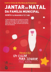 À semelhança dos anos anteriores, a Câmara Municipal tem o prazer de convidar todos os colaboradores a participar na Ceia de Natal que terá lugar no dia 14 de dezembro, quinta feira, às 19h00, no Centro Cívico de Vila Nova de Famalicão. Contamos com a sua presença! |