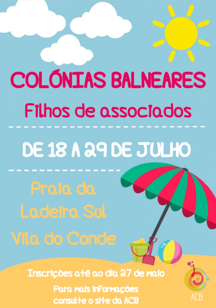 | A ACB - Associação Cultural Beneficente e Desportiva dos Trabalhadores do Município de Vila Nova de Famalicão, irá realizar as Colónias Balneares para crianças entre os 5 e os 12 anos de 18 a 29 de julho, na Praia da Ladeira Sul em Vila do Conde. O horário de saída da ACB será às 8h45 e a chegada à ACB estará prevista pelas 18h15. As Colónias terão um custo de 120€ (inclui transporte, almoço e 1 lanche). Avisam-se todos os Associados, que se encontram abertas as inscrições até ao próximo dia 27 de maio.