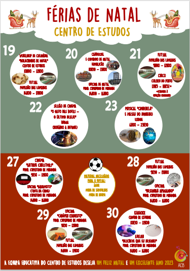 O CATL e o Centro de Estudos, como já nos tem habituado, elaboraram um programa de férias de Natal recheado de atividades lúdico pedagógicas para ocupar o tempo livre, dos nossos jovens.