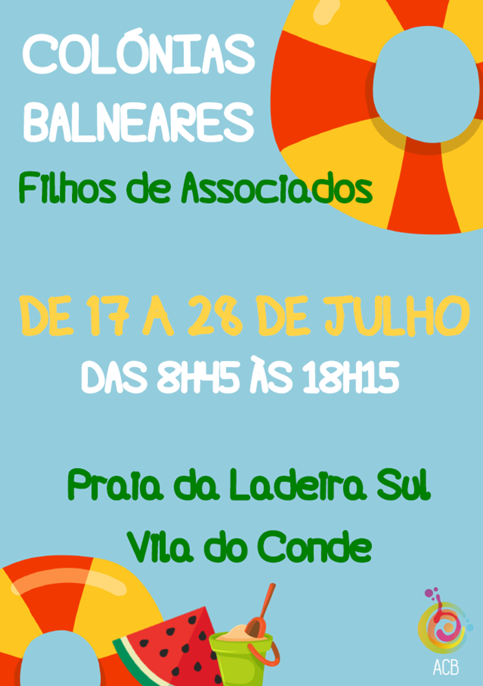 A ACB - Associação Cultural Beneficente e Desportiva dos Trabalhadores do Município de Vila Nova de Famalicão, irá realizar as Colónias Balneares para crianças entre os 5 e os 12 anos de 17 a 28 de julho, na Praia da Ladeira Sul em Vila do Conde. O horário de saída da ACB será às 8h45 e a chegada à ACB estará prevista pelas 18h15. As Colónias terão um custo de 150€ (inclui transporte, almoço e 1 lanche). Avisam-se todos os Associados, que se encontram abertas as inscrições até ao próximo dia 21de abril.