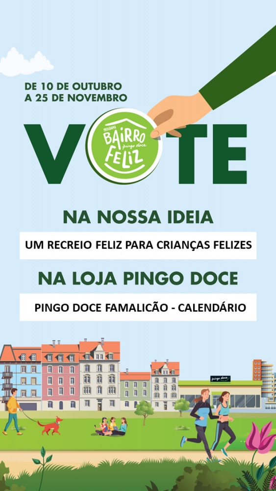 A nossa causa UM RECREIO FELIZ PARA CRIANÇAS FELIZES é uma das finalistas da 3ª edição do Bairro Feliz, na loja PINGO DOCE FAMALICÃO - CALENDÁRIO e precisa da sua ajuda para ser concretizada.