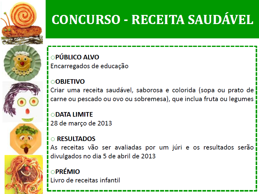Até dia 28 de março encontra-se aberto um concurso dirigido a todos os encarregados de educação para a criação de uma receita saudável. As receitas serão avaliadas por um júri e os resultados serão divulgados no dia 5 de Abril de 2013. A receita vencedora será premiada com um livro de receitas infantis. Concurso Download pdf »