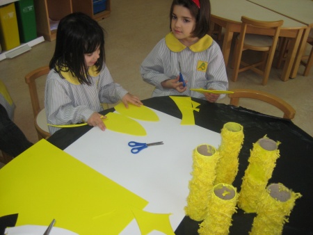 Reciclamos algum material e assim fizemos um coelhinho criativo e colorido para a páscoa. Pintamos de amarelo tubos de cartão, de seguida colamos lã também amarela á volta dos tubos. Fomos assim aos poucos construindo os coelhinhos da páscoa. Para que os coelhinhos ficassem mais doces colocamos dentro de cada um uma surpresa. |