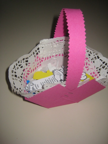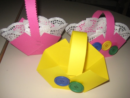 Fizemos umas cestinhas com cartolinas de várias cores, naprões brancos e colagem de botões.