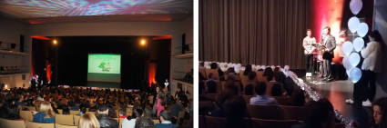 Na manhã do passado dia 19 de Dezembro o espaço do grande auditório da Casa das Artes tornou-se pequeno para acolher todos aqueles que quiseram assistir a mais uma Festa de Natal das Crianças da ACB e do Município de V.N. De Famalicão. Para além dos já habituais discursos na sessão de abertura do espetáculo por parte do presidente da direção da ACB, Sr. Celso Branco e do senhor presidente do Município, Dr. Paulo Cunha, a edição deste ano contou com a participação da academia Dance Fit que apresentou algumas das modalidades que oferece. Foram dois meses de intensivos ensaios, coreografias e elaboração de cenários e guarda-roupa de luxo, que se traduziram numa hora e meia de um maravilhoso espetáculo com muita música e dança, conduzido e representado integralmente pelas crianças e jovens das valências da ACB. Este momento envaideceu e encantou famílias e amigos, resultando num merecido louvor para as equipas educativas e sobretudo para as crianças intervenientes neste espetáculo. Terminado o momento alto da festa, foi chegada a hora da azáfama, com a distribuição das já habituais e muito desejadas prendas de Natal e a oferta de um lanche para as crianças utentes da ACB e filhos dos associados. |