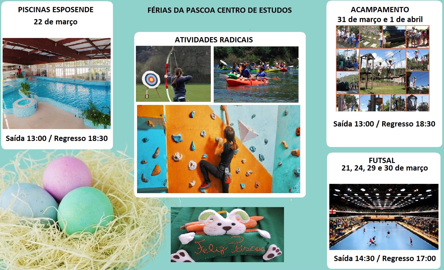 A valência de Centro de Estudos da ACB, como vem sendo habitual, vai realizar entre os dias 21 de março a 1 de abril, atividades nas férias da Páscoa para os jovens da mesma. Após tantos dias de aulas, finalmente o momento chegou. Os jovens vão poder descansar, cantar, pular, gritar ... enfim, desfrutar de um leque de variado de atividades. Férias da Páscoa 2016 Download pdf »