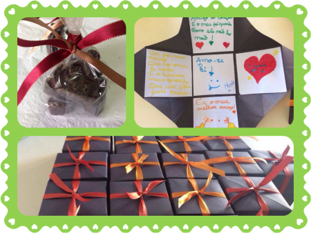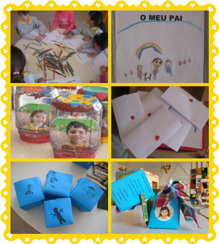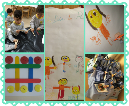 Celebrou-se no passado dia 19 de março o Dia do Pai. Para comemorar esta data as valências da ACB elaboraram uns miminhos para tornar este dia ainda mais especial. Desde pisa papeis personalizados com a fotografia, ao jogo do galo e um livrinho a falar do Pai (JI), sacos personalizados com os pés ou com fotos (CATL), caixinhas com chocolates (CE), e caixas com bolachinhas (SAD). Uma tarefa que todos executaram com muita alegria, empenho e orgulho! Feliz Dia do Pai! |