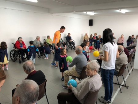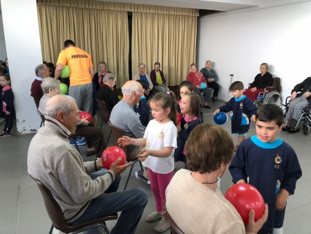 Na manhã de 16 de maio aguardava-nos, à porta da ACB, um autocarro que nos levaria até ao local de trabalho da mãe da Maria Miguel (uma das meninas da nossa sala): o Lar Jorge Reis - Santa Casa da Misericórdia de Famalicão. Após uma receção bastante calorosa por parte dos idosos, seguiu-se uma breve visita pelas instalações que terminou na sala onde, semanalmente, se realizam as aulas de ginástica e para a qual fomos desafiados a participar. Esta aula, dinamizada pelo professor e auxiliada pela animadora sociocultural foi bastante divertida. Depois de criadas todas as equipas (compostas por uma criança e um idoso) fomos, ao longo da manhã, realizando uma série de exercícios adaptados às potencialidades e limitações de cada um. No final da aula, os seniores presentearam-nos com um miminho, carinhosamente elaborado por eles, com recurso a materiais reciclados. Esta visita, realizada no âmbito do projeto educativo, deu-nos a conhecer de perto o trabalho desenvolvido por duas profissões: "Professor de ginástica" e " Animadora Sociocultural" e que neste caso em concreto estão interligadas e trabalham lado a lado ocupando e estimulando, da melhor forma possível, a atividade social e física dos seus idosos. Claramente esta foi uma atividade enriquecedora para ambas as gerações, onde a partilha de saberes, o convívio e o bem-estar gerado, potenciaram e estreitaram a criação de laços entre crianças e idosos. Deixamos o nosso agradecimento aos utentes e à equipa técnica do Lar, pela forma como nos acolheram e pelos maravilhosos momentos que nos proporcionaram. |