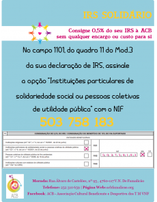 Sabia que ao submeter a sua declaração de IRS pode contribuir com 0,5% do imposto liquidado para a ACB? De uma forma simples e sem qualquer encargo ou custo adicional para si, pode ajudar-nos e ajudar quem mais precisa. Para isso, preencha o campo 1101, do quadro 11, da declaração Mod.3 - Rosto, assinalando a opção " Instituições Particulares de Solidariedade Social ou Pessoas Coletivas de Utilidade Pública" e indique o nosso NIF 503 758 183. OBRIGADO |