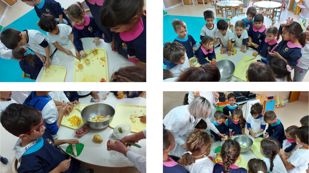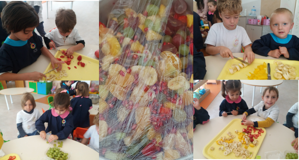 A 16 de outubro assinalamos o Dia Mundial da Alimentação no Jardim de Infância, com a realização de diversas atividades que visam promover e sensibilizar os mais pequenos para a importância do consumo diário de fruta (preferencialmente fresca e da época) como regra de ouro na adoção de uma alimentação saudável. Privilegiando a participação dos pais nas nossas atividades, lançamos o desafio de nos enviarem uma fotografia do/a filho/a com a sua fruta preferida, de forma a construirmos o maior e mais colorido "Arco-Íris da Fruta". E porque, definitivamente, a fruta foi a rainha deste dia, preparamos uma deliciosa, colorida e saudável salada de fruta para sobremesa do almoço deste dia especial, com as frutas que cada uma das nossas crianças elegeu como preferida. Acreditamos que através da realização deste tipo de iniciativas (dinâmicas e descomplicadas) reforçamos a importância de que escolhas alimentares mais conscientes e saudáveis são uma mais valia para a nossa saúde e o nosso bem-estar. |