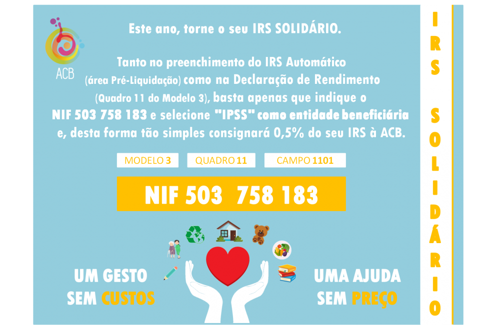 Sabia que ao preencher o seu IRS pode doar 0,5% à ACB sem custos associados? Gostaríamos de contar com a sua estimada ajuda, aquando da apresentação da declaração de IRS. Trata-se de um valor do seu imposto, neste caso 0,5% que iria ser a favor do Estado. Basta apenas que: no preenchimento do IRS Automático (área Pré-Liquidação) como na Declaração de Rendimento (Quadro 11 do Modelo 3), indique o NIF 503 758 183 e selecione "IPSS" como entidade beneficiária e, desta forma tão simples consignará 0,5% do seu IRS à ACB. Seja solidário, agradecemos o seu apoio! |